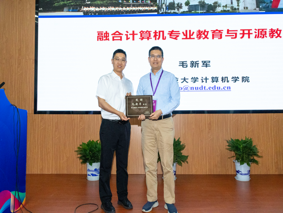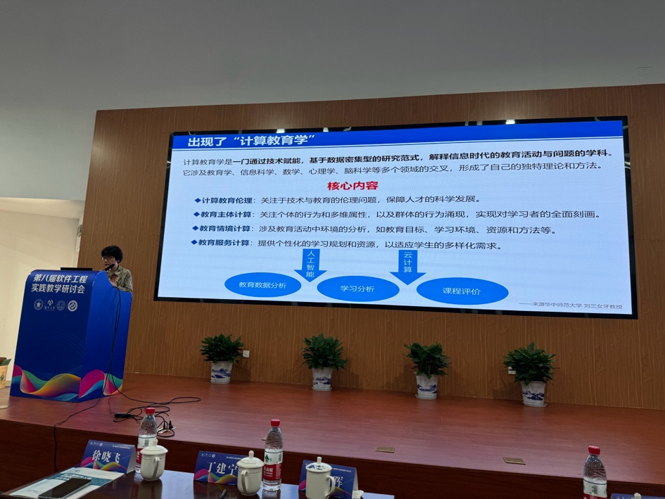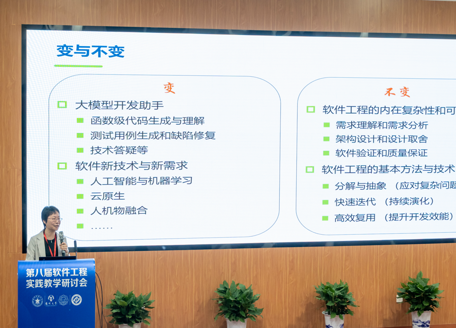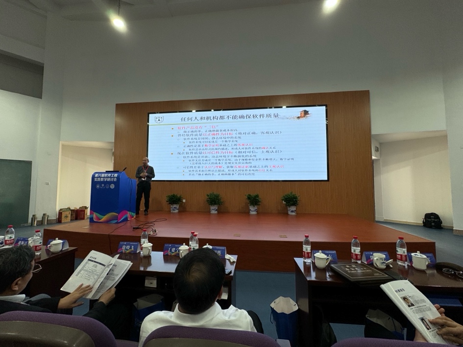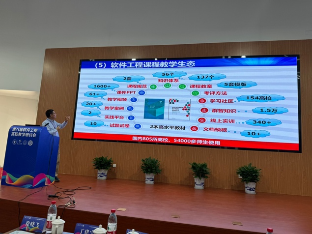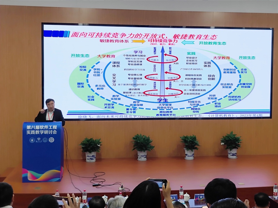 哈尔滨工业大学原副董事长徐晓飞、南京大学教授李宣东、北京大学讲席教授胡振江、北京航空航天大学教授张莉、中航机载系统共性技术工程中心总经理牟明、国防科技大学教授毛新军等6位专家分别作特邀报告。徐晓飞教授以“软件工程专业与软件公司发展之路”为主题,报告了我国软件工程专业与示范性软件公司建设的经验进行回顾总结,提出面向可持续竞争力的敏捷教育及开放式教育生态体系。李宣东教授围绕大语言模型打开的解决问题空间和带来的可信保障挑战进行分析和阐述,探讨了具体的解决方案。胡振江教授全面介绍了教育部101计划的目标、规划、组织与实践情况,并对国内计算机学科的公司产品改革进行了展望。张莉教授分享了参与申请和评审国家自然科学基金“教育信息科学与技术领域(F0701)”项目的一些体会,将教学与科研的融合进行了很好示例。牟明研究员结合国内高等教育的现状,分析了高等教育与机载产业发展需求之间存在的矛盾,分析了需要解决的关键问题,并提出以产业为拉动的产学研用协同生态系统这一解决方案。毛新军教授介绍了学习和分析开源软件、基于开源软件来开展课程实践、借助群智知识来帮助员工解决学习问题、开展群体化学习等,分析了这些公司产品改革所带来的成效。