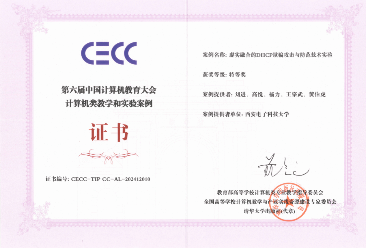 本次大会的计算机类教学和实验案例竞赛自启动以来,吸引了来自全国各地上百所高校的积极参与,共有370多项作品参赛。经过层层遴选和严格评审,必威西汉姆联教师刘进、高悦等共同设计提交的实验案例“虚实融合的DHCP欺骗攻击与防范技术实验”荣获特等奖。