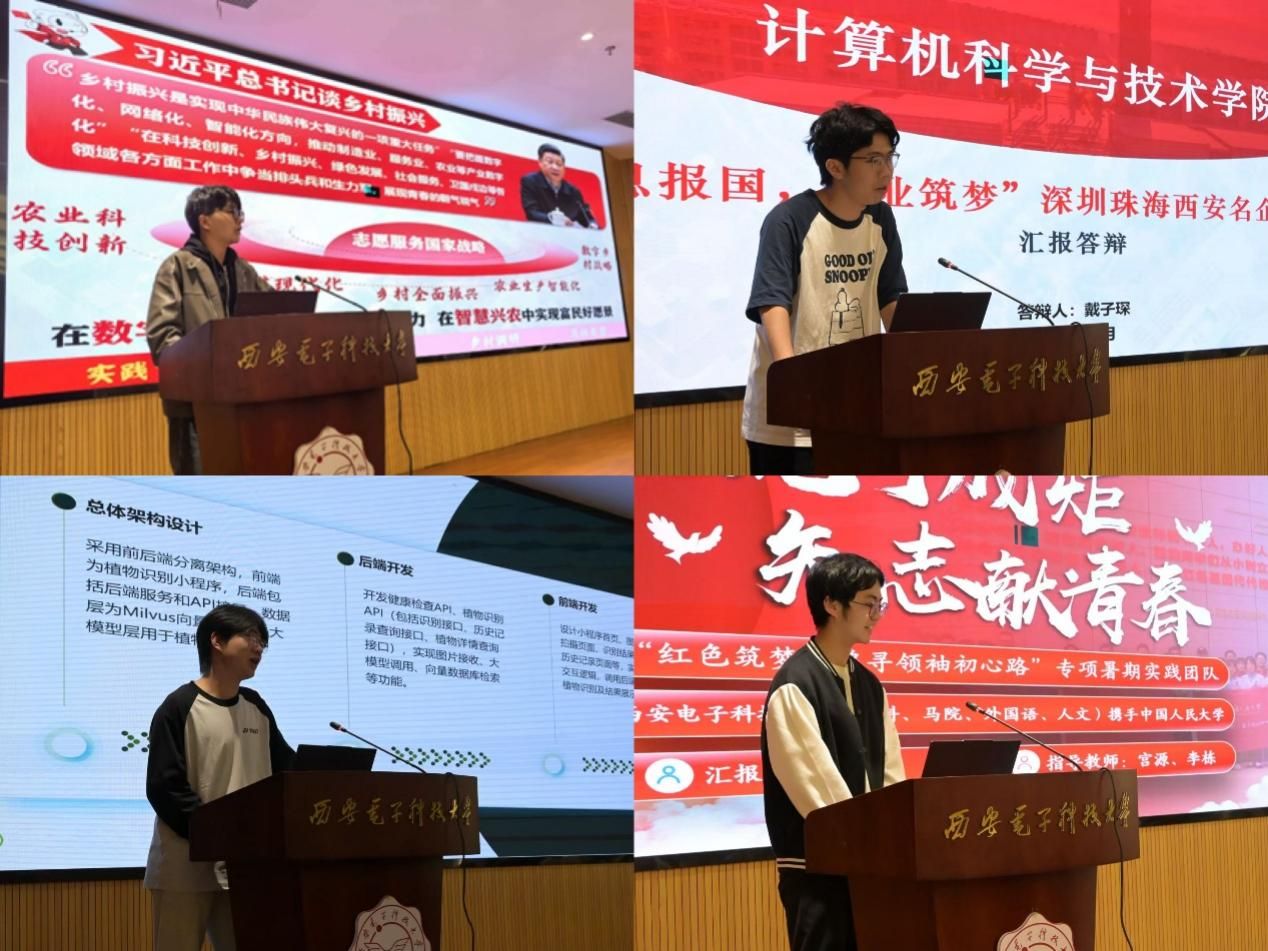 随后,四支实践队依次上台作分享交流。“数字乡村 兴农富农”实践队首先汇报了赴蒲城深入田间地头的调研成果,重点介绍了数字技术在智能种植、溯源管理等方面的应用成效,并针对调研中发现的集体经济薄弱等问题,提出了培育新型农业主体、深化农企合作等建议。“信息报国 行业筑梦”实践队分享了在深圳、珠海、西安十四家龙头企业的走访心得,队员们结合人工智能、网络安全等领域的实践经历,阐述了对“信息报国”使命的感悟与理解,并为公司人才培养建言献策。“秦岭卫士”实践队系统介绍了在周至县8个村落围绕生态、生产、生活、生命“四生融合”开展调研的成果,通过典型案例分析了对生态与发展平衡问题的思考,现场还展示了实践团队自主研发的轻量级植物识别小程序。“红色筑梦追寻领袖初心路”实践队则分享了赴延安开展红色教育的体会,代表以“源代码·编译器·调试器”为喻,生动讲述了红色精神对其成长成才的激励,并向大家展示了包括调研视频和实践报告在内的相关成果,赢得了师生们的广泛共鸣与好评。