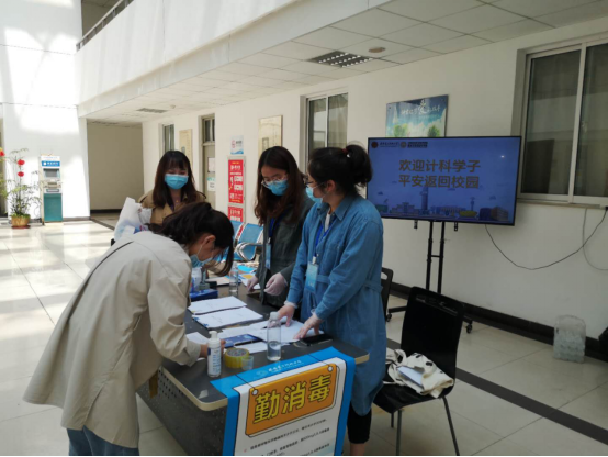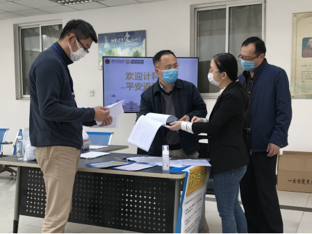 最后,公司工作组一行专程到南校区东门员工返校入口,向现场负责入校登记、引导、检测、消毒等工作的书院负责人与工作人员,了解员工进入校园的具体流程与返校进度,确认了公司已返校员工的相关信息。