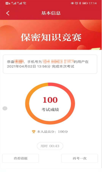 4.奖项设置:活动对参赛个人进行奖励,系统从单次答题正确率达到100%的参赛者中随机抽取,其中,一等奖200名,二等奖300名,三等奖500名,并给予数额不等的电话充值奖励。获奖名单将于5月下旬在“保密观”微信公众号和“保密观”APP公布,参赛者登录“保密观”微信公众号或“保密观”APP即可查询获奖情况。