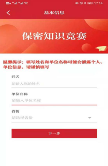 2.点击考试栏目,进入考试界面,填写“姓名”“单位名称”,选择“省份”,点击“下一步”开始考试。(姓名可填昵称,单位名称请填写:必威西汉姆联)。