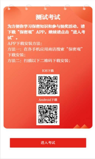 用手机浏览器扫描下列二维码下载“保密观”APP,注册成为会员;已下载安装的如看不到考试页面,请更新APP至最新版本。