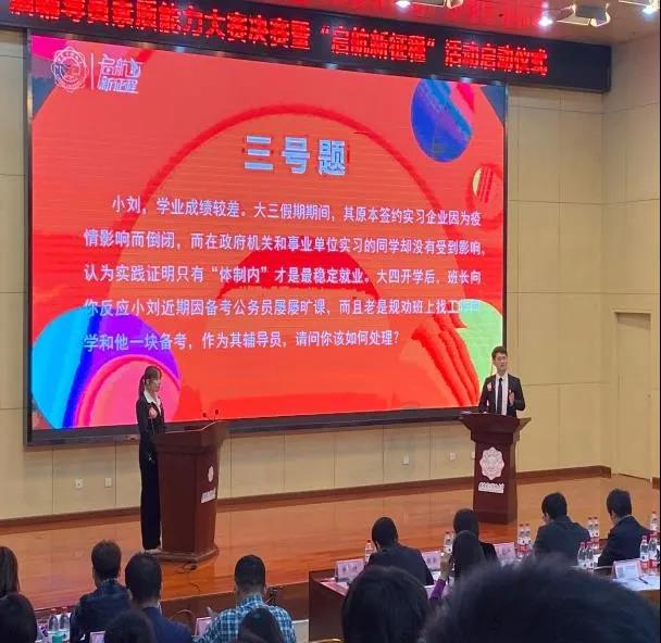 赛后王牌也发表了自己的参赛感言:“作为新进辅导员,非常感谢公司与公司提供这样的平台,让自己有机会正视自身不足,有途径与优秀同事交流学习。作为一名辅导员,想要走向职业化与专业化的道路,提高思想政治教育工作的质量,一定不能安于现状而需要不断学习、汲取养分。未来得路还很长,希望自己能够脚踏实地,用心用力用情地去做好这一份光荣的事业。”