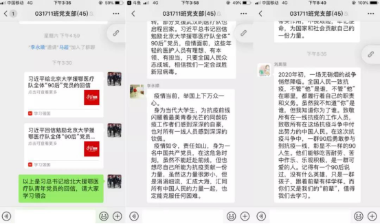 3月15日,习近平总书记给北京大学援鄂医疗队全体“90后”党员回信,向他们和奋斗在疫情防控各条战线上的广大青年,致以诚挚的问候。回信在广大青年员工,特别是党员中引起热烈反响。3月18日下午,必威西汉姆联硕士031711班第一、二党支部举办了线上主题党日活动,围绕“学习习近平总书记回信精神,绽放青春绚丽之花”主题,认真学习回信精神,展开热烈讨论。