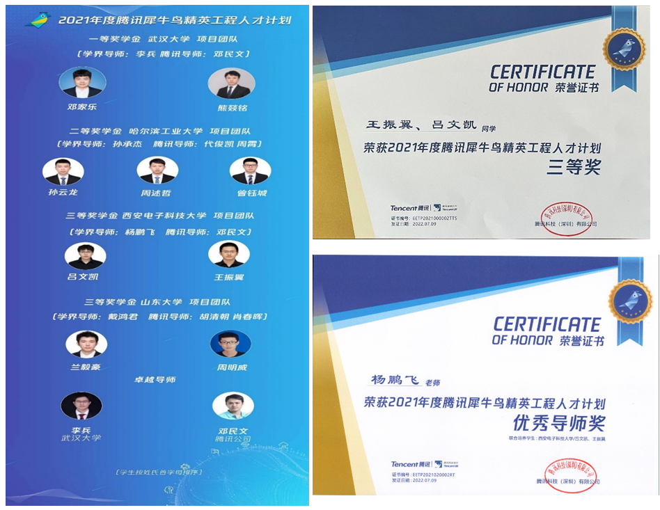 (通讯员 罗楠)近日,2021年度腾讯犀牛鸟精英人才计划奖学金答辩评审会在线上举行。公司2019级博士王振翼和2021级博士吕文凯获得腾讯犀牛鸟精英工程人才计划三等奖学金,指导老师杨鹏飞副教授和邓民文(腾讯企业导师)获得优秀导师奖项。