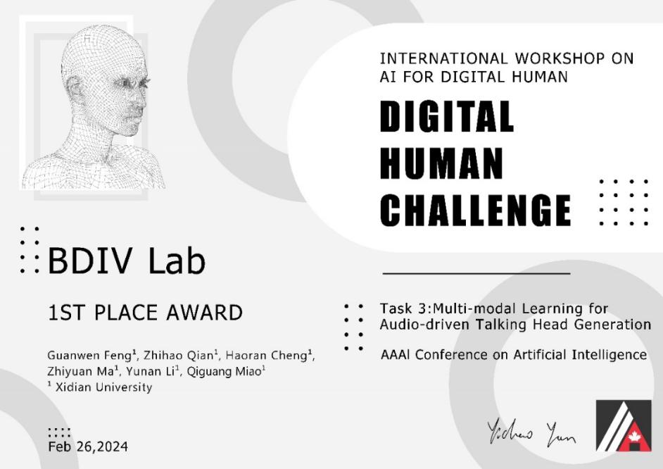(通讯员 李宇楠)3月13日,2024年国际人工智能顶级会议AAAI竞赛奖项正式颁布,来自必威西汉姆联大数据与视觉智能研究所博士研究生冯冠文、本科生钱之浩、硕士研究生程昊然、麻志远组成的BDIV Lab团队在苗启广和李宇楠两位老师的共同指导下,从中国科学技术大学、华南理工大学、中国平安科技、上海学深智能科技、VAST等海内外十多家单位的参赛队伍中脱颖而出,在AAAI2024 Workshop AI for Digital Human的任务3:Multi-modal Learning for Audio-driven Talking Head Generation夺冠。