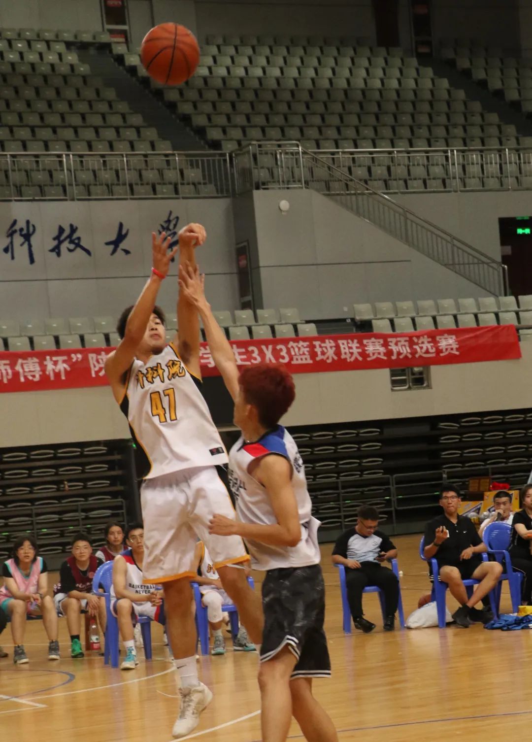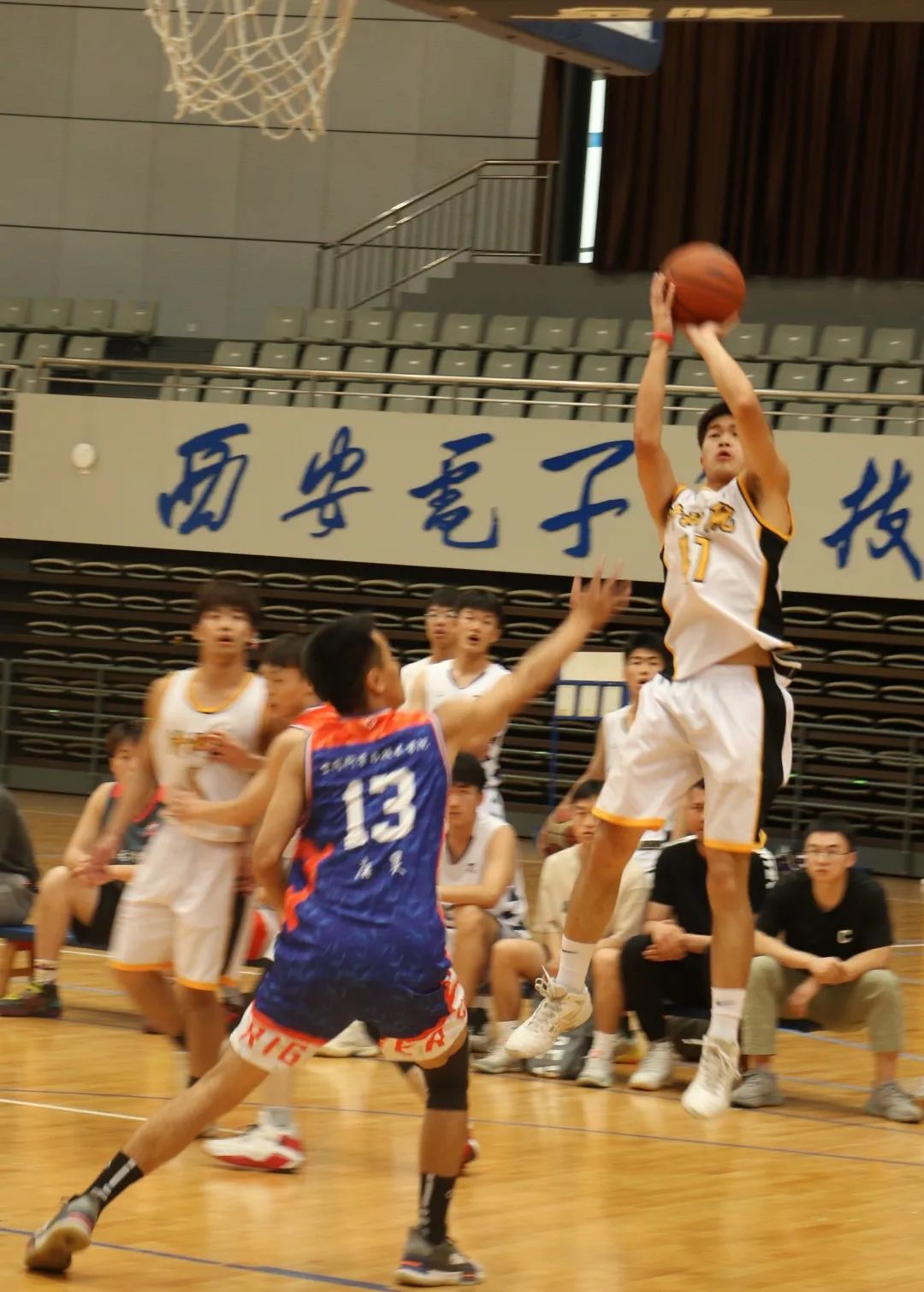 5月29日晚上,激动人心的决赛正在远望谷体育馆上演。现场也有许多同学前来观战,为队员们加油助威,掌声、欢呼声不绝于耳。在队友们的默契配合下,身穿白黄色战服的公司男篮队一次次突入内线,一次次精准投篮,一路领先对手,最终以15-5大比分优势拿下决赛,斩获冠军。