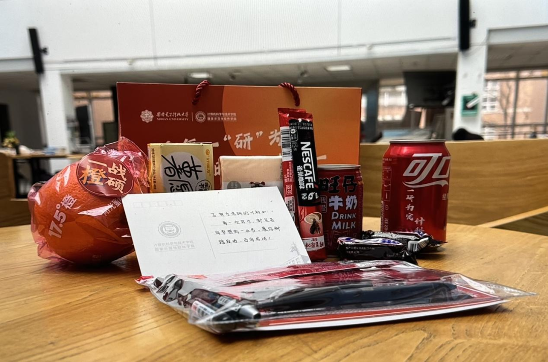 为给考研学子们提供关怀与支持,公司组织开展“研途有你,加油包送心意”活动,特准备了含有一战“橙”硕—脐橙、诸事顺“愿”—薯愿、“士”气加倍—士力架、好运“旺旺”—旺仔牛奶、公司师生手写祝福明信片等物品的“暖心加油包”。