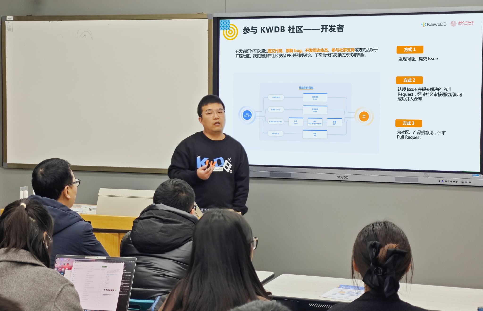 西电先进数据库技术实验室副主任彭延国开场致辞,赵衎衎博士向参会人员分享数据库领域知识和前沿技术。赵衎衎博士首先围绕数字化时代我国基础软件产业发展趋势变化及当前数据库人才需求方向等热门话题与在校师生展开分享,帮助同学们对数据库产业整体现状建立起全局认知。随后,详细介绍了 KWDB 在多模、时序数据处理、分布式等方面的技术创新及突出优势,以及在智慧工厂、数字能源、政务交通等多领域的应用成果,帮助同学们快速了解浪潮开源数据库的行业领先性及商用进展,呼吁广大师生在学术研究中关注真实场景问题并提出解决方案,极大地激发了同学们在开源软件领域的技术热忱。值得一提的是,KWDB 社区针对技术从业者、专业及非专业学科在校生设计了多元化的贡献方式,成为同学们拓宽视野、增加实训机会,提升动手能力的重要平台,对于促进产教融合、高校人才选拔及培养也有重要意义。