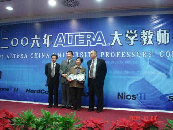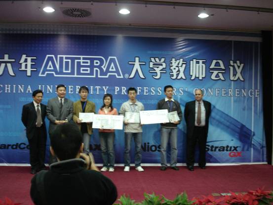 相飞、宁文博和朱伟同学不但获陕西一等奖及第一名——Altera杯,而且还一举夺得全国二等奖,该队指导老师郭万有教授获得“Altera卓越导师奖”,他们的作品“实时视频处理机顶盒”针对模拟电视与数字电视不兼容的问题提出了一种新的解决方案,该方案将FPGA信号处理技术和NiosII多核处理器技术相结合,实现了视频转换、图像显示、音乐播放和菜单显示等功能,具有成本低廉、可靠性高、稳定性好、实时性强、易于升级等特点,充分体现了Nios处理器的优势,赢得了一致好评。