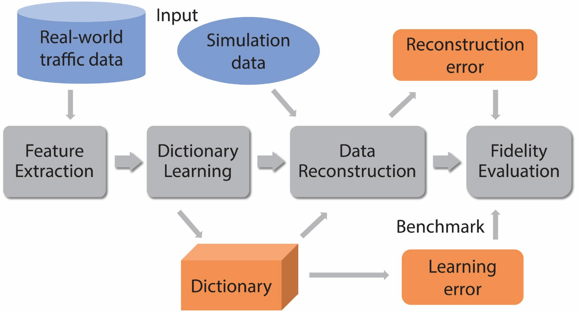 该方法主要包括四个阶段:(1)从现实世界的交通数据中提取时空车流特征,(2)从真实世界数据进行字典学习(即构建TPD),(3)基于字典的重建待评估的虚拟交通流数据,以及(4)基于重建误差的逼真度量化评估。图1给出了该方法的框架示意图。具体地,给定真实世界的交通轨迹数据作为输入样本,该方法首先提取出可以表征车辆每个时刻在前进方向上和侧向运动方向上的特征,然后采用自适应字典学习算法来建立TPD以表征常见的交通行为特征,相应的学习误差被设置为TPD表达能力的基准。给定任意一个待评估逼真度的模拟交通流轨迹数据,该方法通过基于TPD的重建来近似该轨迹数据,并计算得到重构误差。最后,通过比较字典的重建误差和学习误差,可以客观地评估虚拟流量的逼真度。以真实世界车流为参考,图1给出了几种不同虚拟交通轨迹数据的逼真度评估结果。