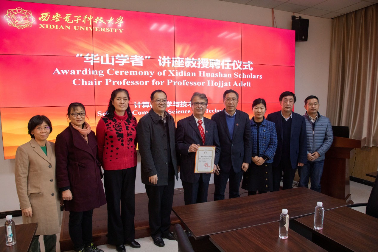 聘任仪式上,王宇平介绍了Hojjat Adeli教授的个人情况。李建东代表公司宣读了聘任决定,并为Hojjat Adeli教授颁发聘书和西电校徽。