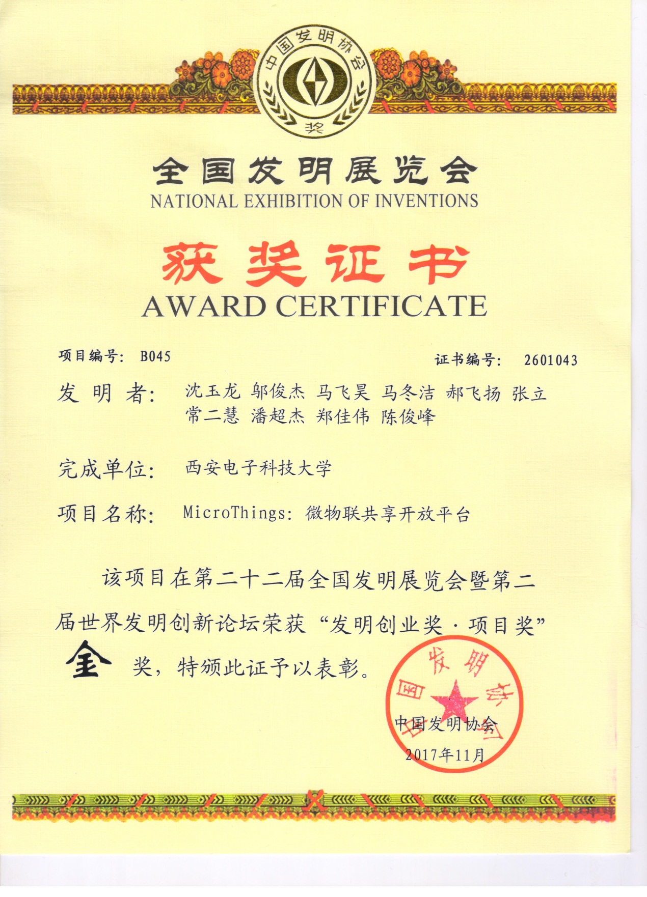 本次展览会除国内各省市、自治区及有关行业协会、解放军等单位参展外,境外有40个国家、国际组织派团参展,参展项目多达1200余项,其中公司推荐的由马建峰教授主导研发的“秦盾”云加密数据库系统和由沈玉龙教授主导研发的MicroThings:微物联共享开放平台2个项目均斩获金奖。