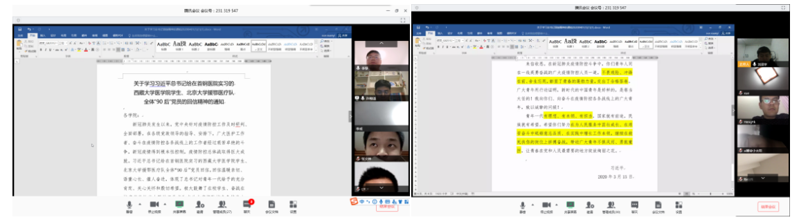 (通讯员 刘泽宇 孙煊溢)新冠肺炎疫情爆发以来,广大医护工作者、奋斗在疫情防控各条战线上的工作者披荆斩棘、勇挑重担,为坚持打赢疫情防控总体战不遗余力。3月15日,习近平总书记给在首钢医院实习的西藏大学医公司员工、北京大学援鄂医疗队全体“90后”党员回信,向他们和奋斗在疫情防控各条战线上的广大青年,致以诚挚的问候。回信在广大青年员工,特别是员工党员中引起热烈反响。4月3日晚上7点30分,必威西汉姆联硕士031712班第一、二党支部通过线上会议方式举办了“青年不惧风雨、抗疫勇挑重担”主题党日活动,认真学习习近平总书记回信精神,并开展热烈讨论。