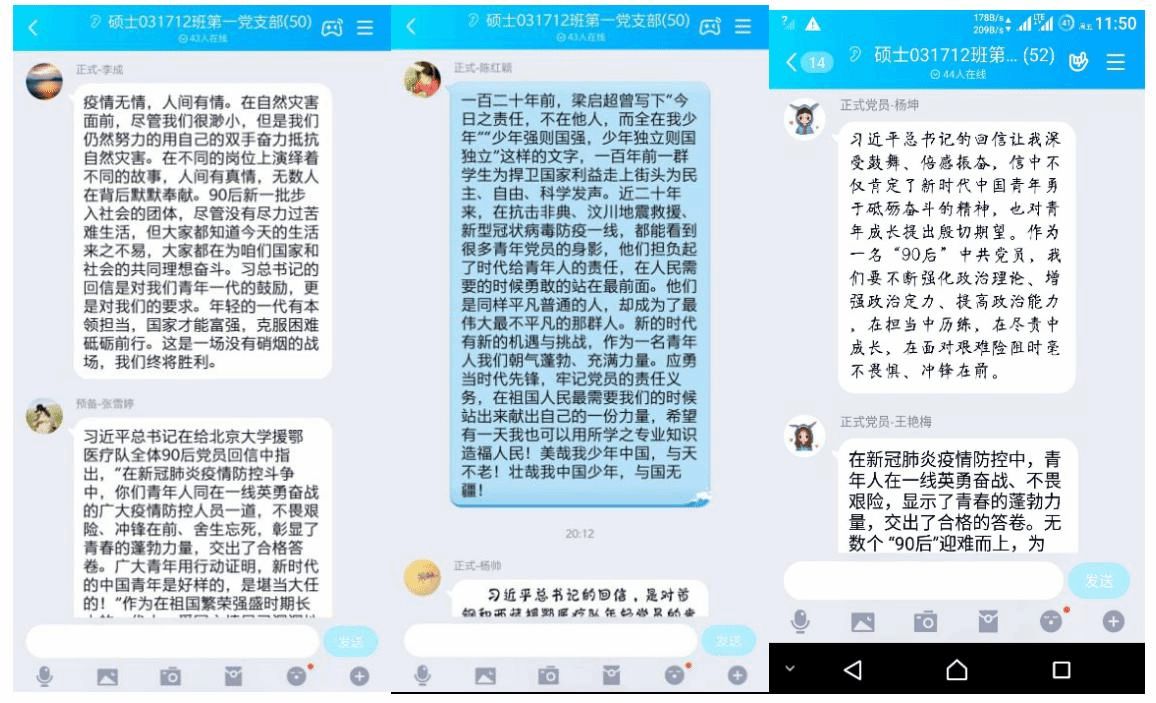 第一党支部成员汪新宇说道:“有人说,90后是垮掉的一代,很多都是独生子女,被父母捧为‘掌上明珠’,似乎很难指望能扛住什么风雨,‘任性’‘自我’‘娇气’‘不靠谱’时常成为贴在我们身上的标签。然而,在疫情面前,支援湖北的医护人员中,有1.2万多名是90后,他们日夜奋战在疫情防控的各个战线、各个关口、各个岗位。主动请战、冲上前线、披荆斩棘、勇挑重担,留下了一个个刚毅果敢、充满活力的身影。90后、00后用实际行动证明自己是抗疫战场上的勇士,为祖国和人民撑起了一片天。”