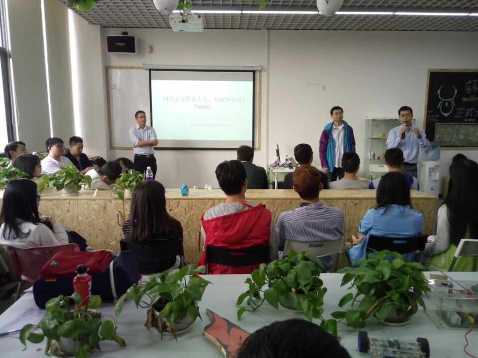 本次活动由计算机公司沈玉龙副经理主持,首先由诸葛建伟老师介绍了CTF的发展历程,及参赛的一些基本要求和途径。然后诸葛建伟老师和姜开达老师分别介绍了蓝莲花战队和0ops安全技术战队的组建历程及其取得的成绩。蓝莲花战队和0ops安全技术战队是中国参与CTF网络安全技术竞赛成绩最为突出的国际知名战队,曾连续多次入围DEFCON CTF全球总决赛,并获得优秀战绩,他们的成功历程也点燃了同学们的热情。