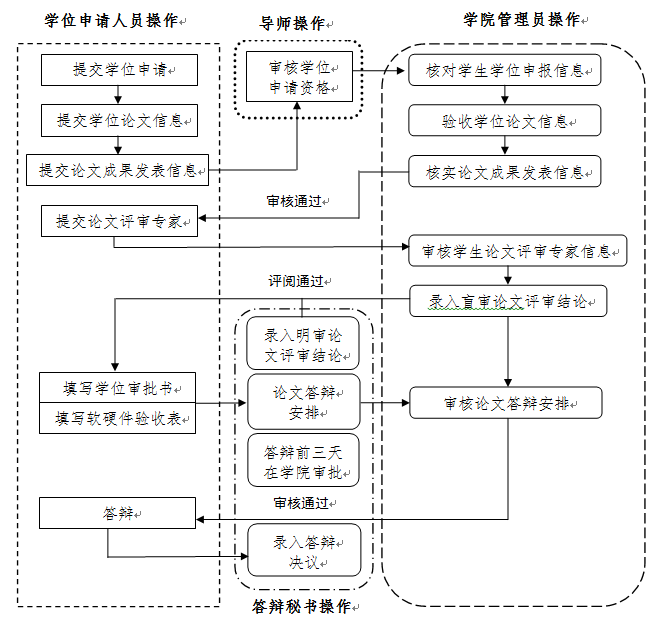申请学位通过研究生管理系统进行,学位申请人员、导师、公司管理员及答辩秘书登录http://gr.xidian.edu.cn,在“研究生管理系统(新)”栏中进入,登录后流程如下: