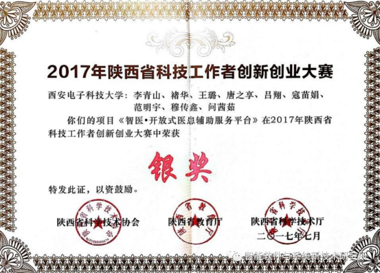 李青山教授与褚华副教授指导的项目《智医.开放式医患辅助服务平台》获得2017年陕西省科技工作者创新创业大赛银奖。