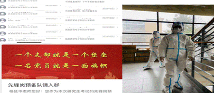 在得知公司研考工作需要大量志愿者后,支部书记杨延华报名党员先锋岗预备队,迅速投入公司考点考生信息摸排工作,紧急与联络单上的考生一对一电话联系,询问相关情况,督促他们尽快填写考生情况摸排问卷,并与电话联系不上的考生短信联系,确保不漏一人。她在研考期间承担了公司为封控区考生专设的隔离专班的考务工作。