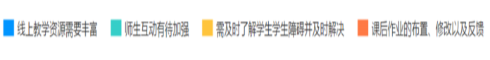 从上图可以看出,员工对教学资源需求度较高,特殊时期员工无法前往图书馆及实验室进行课程资料的获取,需要加强电子书籍、课程PPT、课后视频等多方面的线上教学资源的提供,需要加强课后作业的布置、修改以及反馈,及时了解员工知识掌握程度,进一步了解员工的学习障碍。