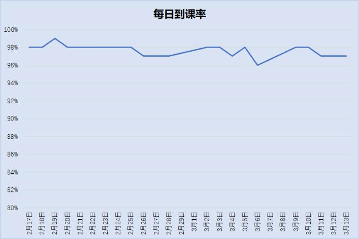 为确保员工按时上课,公司每天都会对40~50个班次的全部课程进行到课率统计。教务老师每天晚上统计汇总后,将到课情况反馈给辅导员,辅导员负责与缺课的员工联系交流,了解情况,分析问题,督促他们准时上课,努力做到“一个都不能少!”