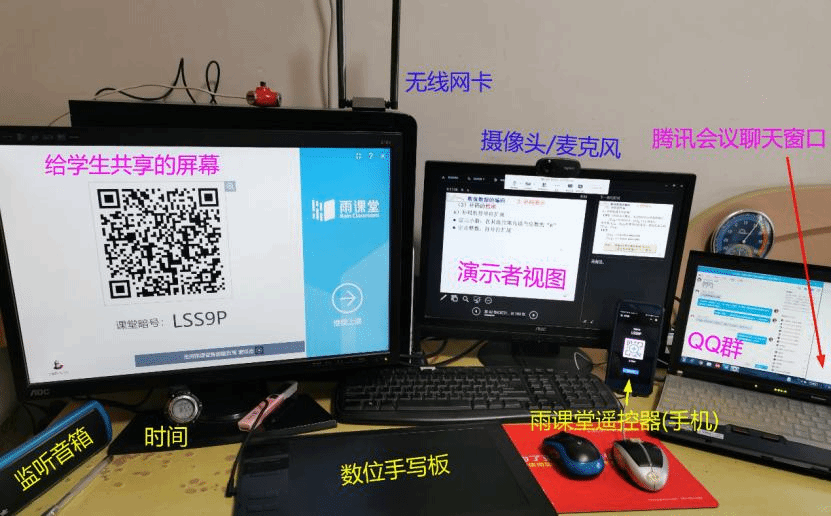 在教学设备的选用上,车老师依托电脑、手机、音箱、数位板、手写笔等构建了一套体系化的在线教学环境。三个在线教学软件各对应一台显示器,其中台式电脑配备了一台音箱,可以随时收到同学们在课堂上的实时消息。其中,雨课堂还专门有一台用于遥控的手机。数位板与手写笔为同学们提供了与线下课堂体验类似的实时板书环境。车老师同时利用录屏软件对课堂进行全程录制,课程结束后仔细剪辑后发送给同学们,供大家查漏补缺。