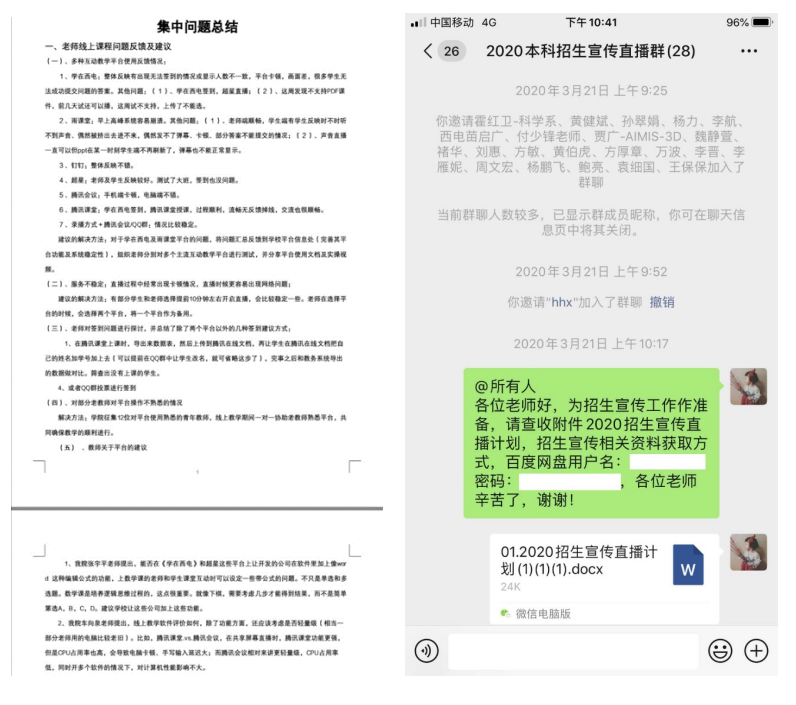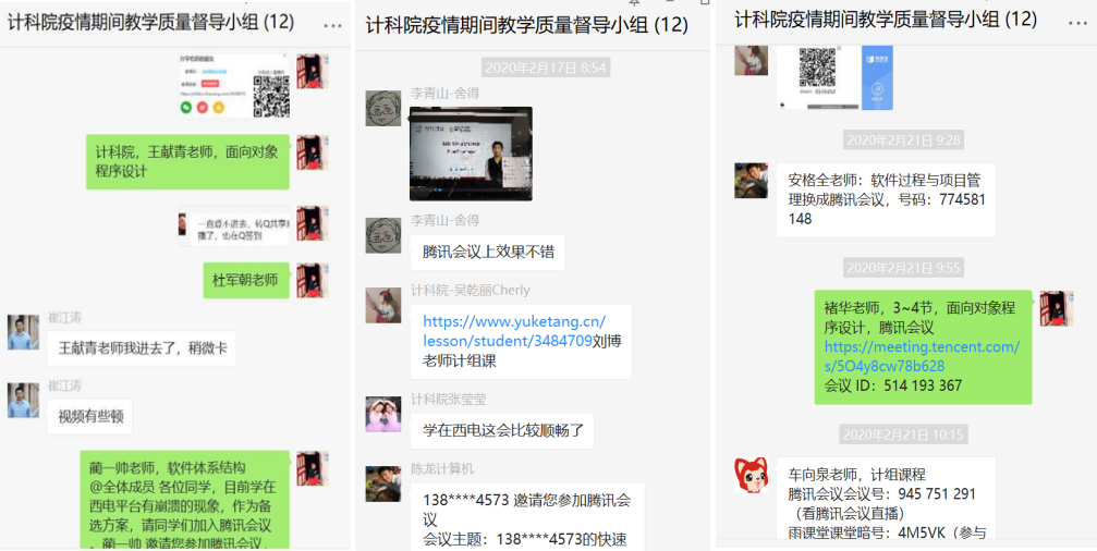 为确保教学质量,全面了解线上教学情况,公司成立了以8位院领导和办公室主任为主体的线上教学督导组,4位教务干事每人负责对接2个研究所,针对8个研究所的​必威西汉姆联全体老师形成“网格化”督导模式。马继红老师负责软件工程研究所和智能软件与系统新技术研究所,上课前,马老师会把所有课程的链接、二维码、课堂暗号等收集到,然后发到督导群。通过辅导员、线上督导组、教务干事等渠道,随时收集员工对教学质量的反馈意见,发现问题,解决问题,做好线上教学的自我监控和员工的舆论引导工作。在全体教务老师的共同努力下,线上教学至今,未发生一起教学事故。
