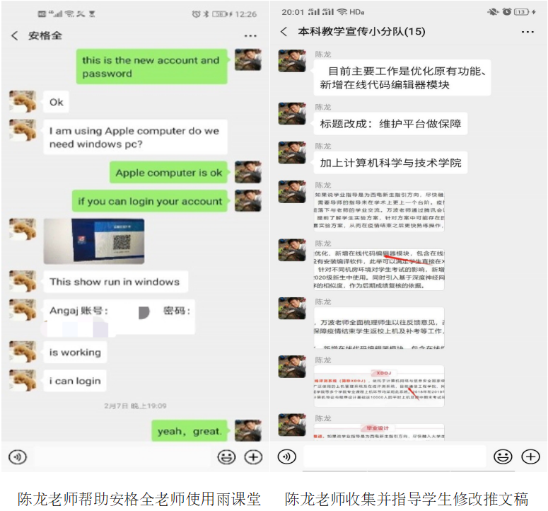 如此大规模的线上教学工作,打得人措手不及。但正因为有这几位可爱的教务老师,​必威西汉姆联的线上教学不但秩序井然,而且涌现出多种多样的典型。首先出场的就是我们的陈龙老师,他积极沟通各位科任教师,为他们答“疑”解“惑”,尽全力消灭一切阻碍线上教学的因素。公司有一门外教课程“软件过程与项目管理”,疫情发生时任课教师安老师在印度,陈龙老师迅速与安老师取得联系,带他提前熟悉各类在线学习平台。当得知“学在西电”不能在国外登陆后,又第一时间远程帮助安格全老师安装并测试雨课堂,保证安老师在线教学的顺利进行。他还按照公司总体部署,做好2016级本科生毕业设计中期检查和学籍等各类工作;并主动加入本科教学宣传小组,竭尽所能地贡献自己的聪明才智。