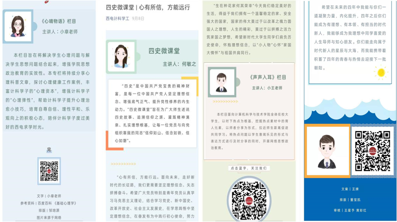 积极开拓网络思政育人阵地,推出精品网络栏目品牌。西电计科学工微信公众号在深化理论学习、推进四史教育、追踪思政热点、反映老员工活、公司工作动态、树立青春楷模等方面发挥作用。通过微信公众号、线上直播、周点名等方式持续开展网络思政、心理健康教育,视频、漫画、推文多种方式受到员工欢迎。疫情期间公司扎实组织开学“云”点名工作,被陕西省教育厅官网报道。结合疫情防控部署,围绕形势与政策热点,先后开展了“共上一堂思政大课”,学习两会精神、“我们都是收信人”、“心向阳光,青年有担当”抗疫英雄事迹分享会等活动。开设时政热点专栏《声声入耳》、四史教育专栏《四史微课堂》、心理育人专栏《心晴物语》、价值引领专栏《师说新语》、引导老员工读原文悟原理《初心诵》有声栏目,树立身边榜样的《计科学子》栏目等。推出“计科成长学堂”栏目,设“学科竞赛指导系列”、“学涯与职业发展规划指导系列”和“专业教育系列”,邀请专家为员工答疑解惑。