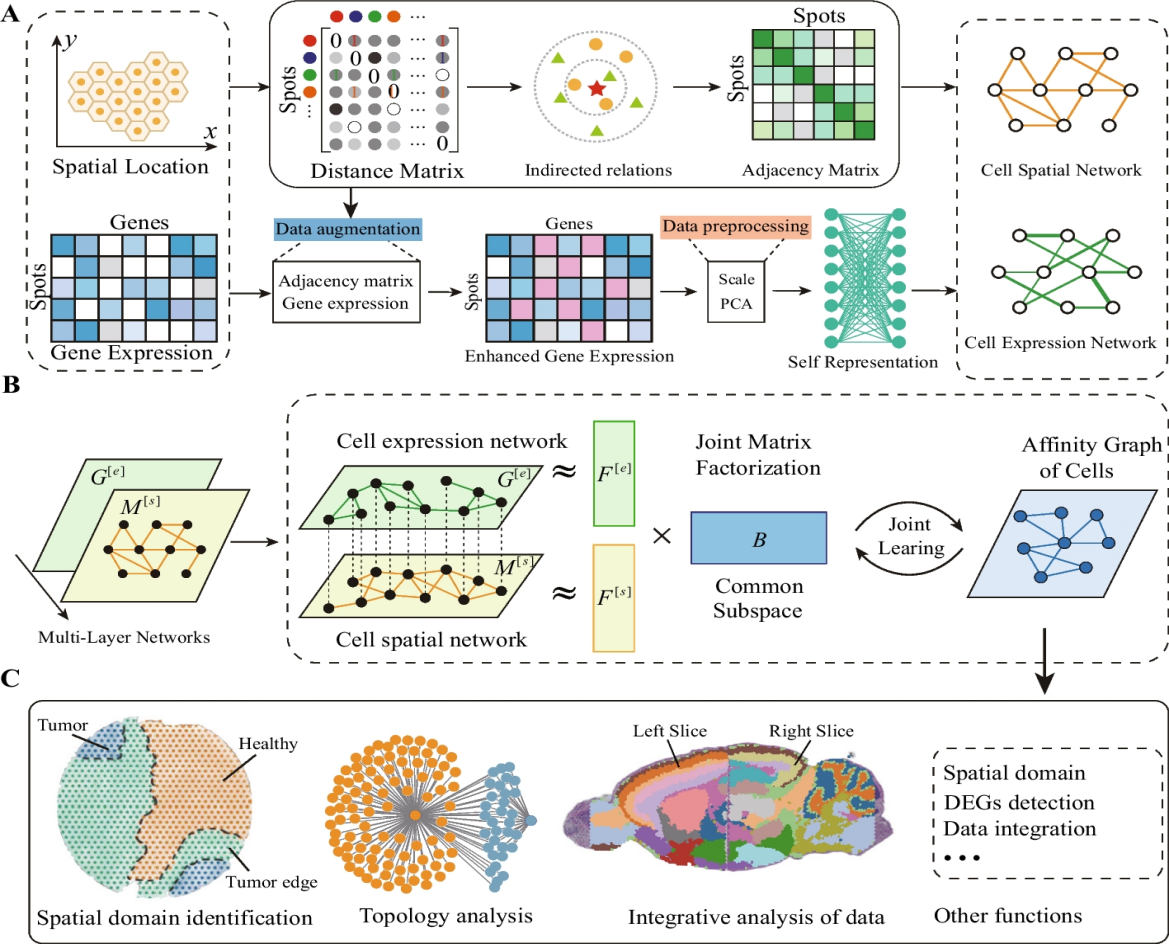 该研究针对空间转录组数据存在噪声高、分辨率低、空间域集成分析难等关键问题,通过自动学习空间点之间的关联关系,全面刻画空间组织切片中的关键区域,提出了面向空间转录组的多层网络模型MNMST。该模型利用转录表达与位置信息分别构建细胞表达网络与细胞空间网络,形成空间转录组细胞多层网络。通过分析细胞多层网络拓扑结构,克服空间转录组多模态数据信息异质性冲突问题。进一步,采用联合非负矩阵分解算法挖掘多层网络共享特征,从而显著性提高细胞空间模式的可解释性。MNMST能够对现有的空转转录测序平台数据实现全覆盖,同时精确地识别空间组学切片中的肿瘤区域、健康区域、肿瘤边缘区域,可准确地识别并且可视化癌症域关联的基因分子标志物。该研究具有重要的医学研究价值,为解析临床空间肿瘤组织切片和探索癌症发病机制提供有效的分析工具与计算手段。