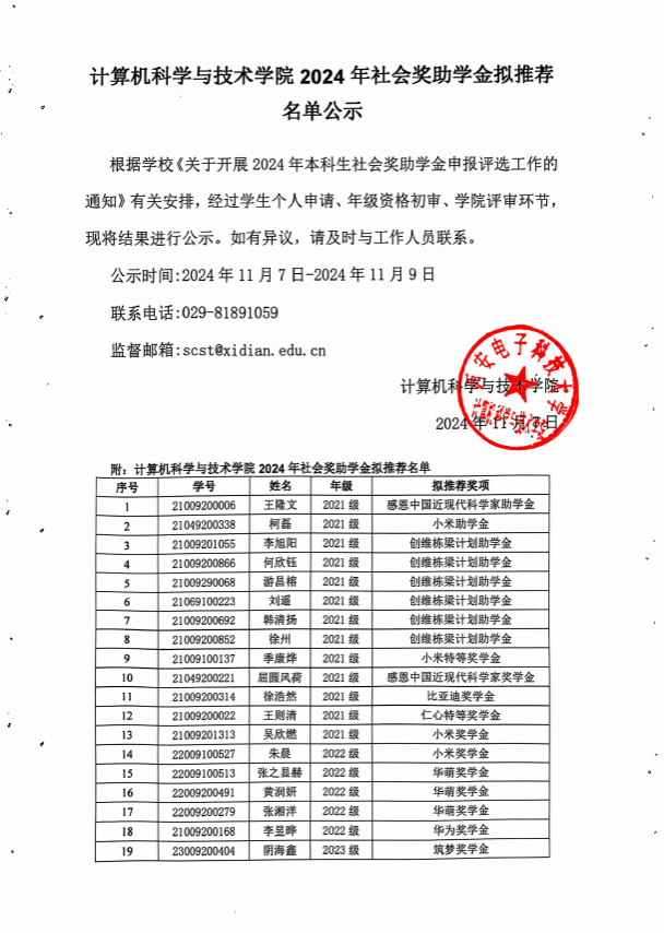 2024年社会奖助学金拟推荐名单公示