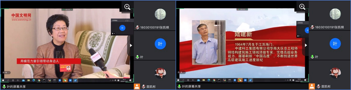 活动开始,全体党员同志观看了四个老一辈道德模范人物的采访视频。中国核潜艇之父、全国道德模范黄旭华院士牺牲了陪伴家人的时间,换来了国家战略核潜艇的问世,表示作为共产党员,对国家的忠就是对父母最大的孝;全国诚实守信模范呼秀珍同志是一名兢兢业业的优秀教师,她指出志向是人生的航标,而和党和人民的利益联系在一起的志向是各种志向的底盘;全国道德模范钱七虎院士捐献了他曾获得过的全部奖金,扶助贫困员工,帮助困难群众,履行着一位共产党人为共产主义事业奉献终生的誓言,他表示共产党人追求的不是个人的名利,而是为人民作贡献,所以我们不需要奢侈的生活;全国道德模范陆建新同志先后参与建设44项工程,工程总高度达3600余米,37年风雨兼程,37年驰骋工地,淡泊名利,敬业奉献,续写新时代工匠精神的新篇章。