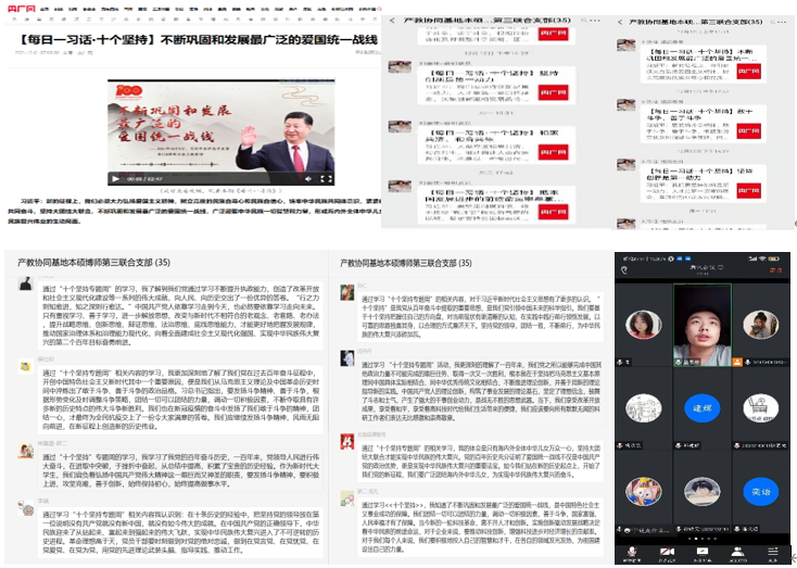 在十九届六中全会精神专题学习周内,组织委员刘瑞佳同志每日从央广网《每日一习话·十个坚持》栏目中推送一篇需要学习的内容,其中包括“不断巩固和发展最广泛的爱国统一战线”、“敢于斗争、善于斗争”、“坚持创新是第一动力”、“和衷共济、和合共生”等主题的文章。支部党员们每天坚持学习推送的内容,支部内形成了热烈的学习氛围。