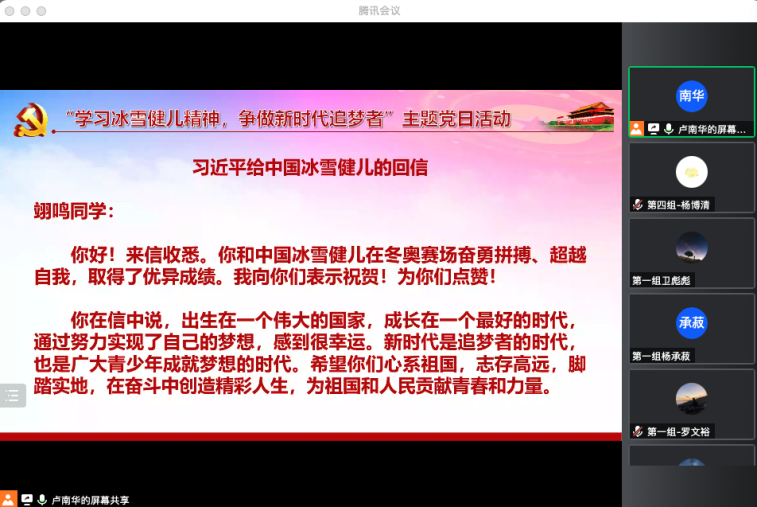 (通讯员 李瑞雪)2022年3月25日,智能软件与系统新技术研究所本硕博师第一联合党支部开展“学习冰雪健儿精神,争做新时代追梦者”的主题党日活动,同学们深刻地感受到了冰雪健儿们奋力拼搏的精神,学习了习近平总书记重要回信精神。