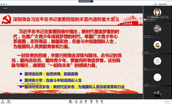 3月25日下午,必威西汉姆联智能媒体与数据工程研究所本硕博师第三联合党支部组织全体党员开展“用奋勇拼搏奏响追梦乐章”主题党日活动,集体学习习近平总书记给中国冰雪健儿代表的回信内容,深受鼓舞、倍感振奋,大家纷纷表示一定牢记习近平总书记的殷切期望和谆谆教诲,认真领会习近平总书记重要回信的丰富内涵及重要意义,从拼搏奋进、永不放弃的体育精神中汲取伟大力量,坚定理想信念、磨炼坚强意志、锻炼强健体魄、勤奋上进、追求卓越,努力成为可堪大用能担重任的栋梁之才,为祖国和人民贡献青春和力量。