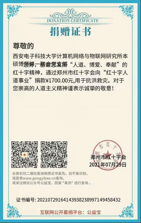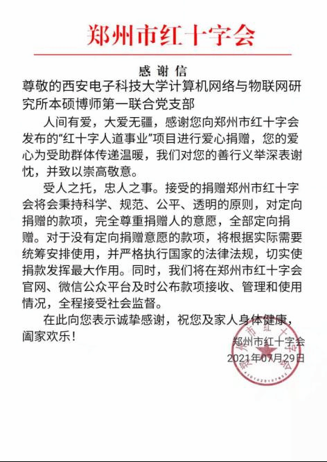 灾情深深牵动着每一个中国人的心,7月24日,必威西汉姆联计算机网络与物联网研究所本硕博师第一联合党支部发起“防汛抗洪驰援河南”募捐倡议,倡导大家尽自己所能献出一份爱心,以实际行动支持河南防汛救灾。该倡议得到支部党员们的积极响应,截至日前,计算机网络与物联网研究所本硕博师第一联合党支部共筹集到了1700元善款。该善款已汇至河南省郑州红十字会账户,用于抗洪救灾工作。