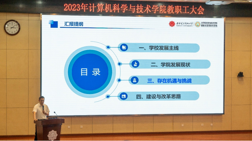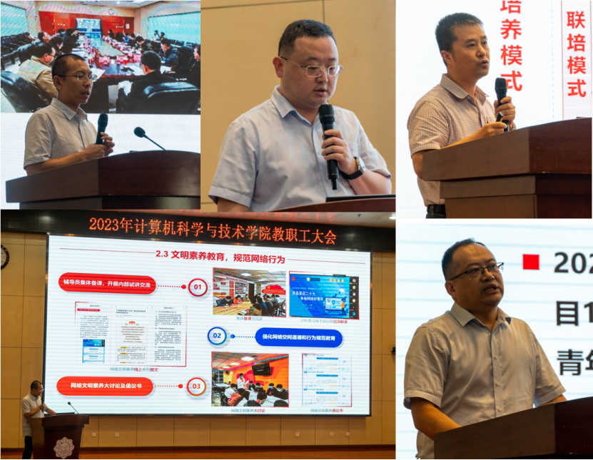 副经理万波、杨力、李瑞、赵韩强分别就公司本科公司产品、研究生公司产品、特色化示范性软件公司建设、员工工作、行政人事工作进行了汇报,并立足公司实际,总结梳理了近几年特别是2023年以来,分管工作取得的进展和存在的不足,结合主题教育的相关调研成果,围绕本科公司产品审核评估、核心课程体系建设、人才培养、特色化示范性软件公司建设与发展、员工工作、人才引进和教师培养、综合治理、安全稳定等重点工作向全体教职工汇报了工作思路和后续的工作举措。