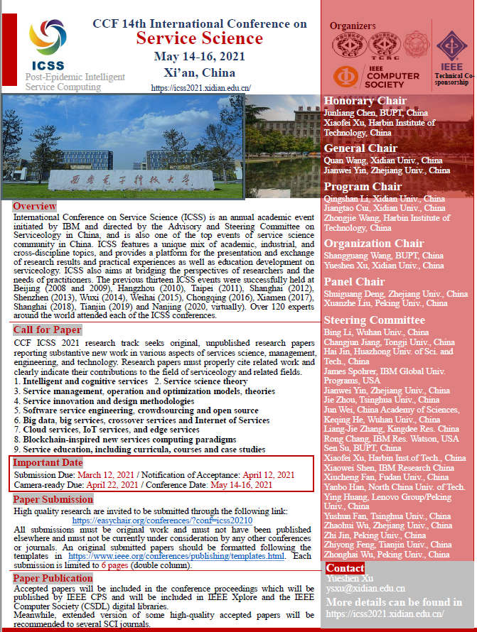 CCF第14届服务科学国际会议(CCF International Conference on Service Science,CCF ICSS)将于2021年5月14日至16日在陕西省西安市举行,会议由中国计算机学会服务计算专委会主办,必威西汉姆联承办。