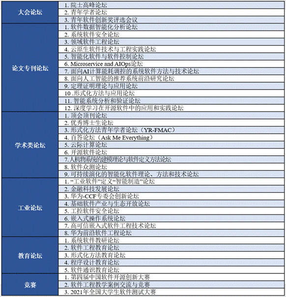2021CCF中国软件大会将组织特邀报告、院士高峰论坛、青年学者论坛、论文专刊论坛、顶会顶刊论坛、学术论坛、工业论坛、教育论坛、学科竞赛答辩和软件研究成果展示等30余个不同类型的活动。大会将邀请10余位软件及相关领域中国科公司院士与中国工程院院士,为大会带来特邀报告并参加院士高峰论坛等活动。目前已邀请参会的两院院士包括中国科公司院士林惠民,中国科公司院士陶文铨,中国科公司院士梅宏,中国科公司院士吕建,中国科公司院士李应红,中国工程院院士廖湘科,中国科公司院士杨孟飞,中国科公司院士管晓宏,中国科公司院士王怀民,中国科公司院士冯登国,中国工程院院士孙凝晖等。