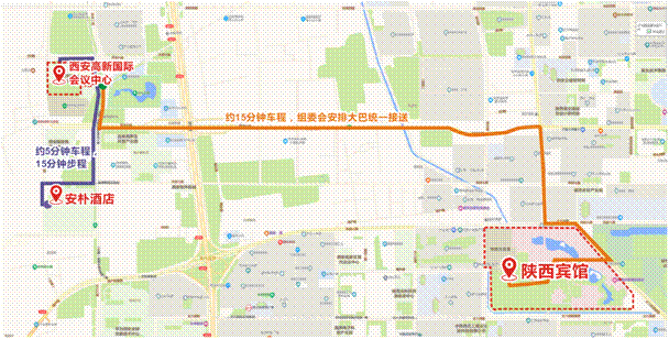 本次大会优先推荐陕西宾馆作为各参会代表的住宿酒店,陕西宾馆可提供超过1200间客房且各类型房间的价格也较为合适。陕西宾馆距离本次会议的举办地西安市高新国际会议中心约15分钟车程,组委会将安排大巴统一接送。安朴酒店距离西安市高新国际会议中心约5分钟车程,15分钟步程。