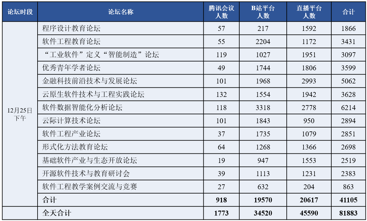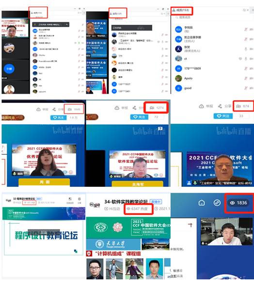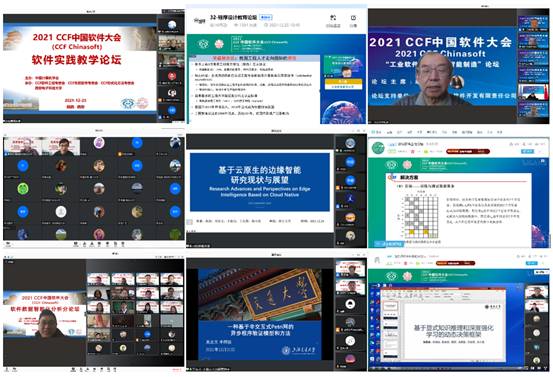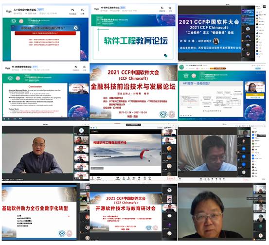 (通讯员 徐悦甡,王智莹,崔笛)在经过精彩纷呈的大会首日后,12月25日,2021 CCF中国软件大会(CCF ChinaSoft)迎来第二天,共展开了23场并行分论坛,继续给参会代表和观众带来丰富的会议内容。其中包括7场专刊类论坛、4场学术类论坛、6场教育类论坛、5场工业类论坛与1场竞赛交流与答辩。25日的大会继续吸引国内外软件相关领域师生与从业人员的参与,当天上午与下午各论坛的腾讯会议室同时在线人数均接近或超过900人,B站直播间同时在线人数均超过1.5万人,线上直播平台同时在线人数均超过2万人。当天累计腾讯会议室在线参会人数超过2000人,B站直播间累计在线人数超过3万人,线上直播平台累计在线人数超过4.5万人,全天合计超过8万人。
