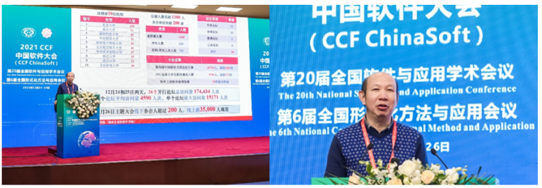 (通讯员 徐悦甡,李悦辰,崔笛)经过了12月24日与25日精彩纷呈的大会各论坛活动后,12月26日2021 CCF中国软件大会(CCFChinaSoft)在北京友谊宾馆线下开幕,并通过线上直播平台与B站全程直播。受原会议举办地陕西省西安市新冠疫情重大变故的影响,大会组委会对本届会议的举行方式进行了调整,3天的大会活动安排为,12月24-25日通过线上的方式进行各分论坛,12月26日在北京友谊宾馆设立线下会场,包括开/闭幕式、院士特邀报告、NASAC青年创新奖报告、第四届中国软件开源创新大赛颁奖等活动。9位中国科公司院士、中国工程院院士(林惠民、梅宏、吕建、廖湘科、杨孟飞、王怀民、冯登国、孙凝辉、钱德沛)与200余位代表线下参加了大会,其余代表与观众线上参会。26日在线直播平台全天在线人数超过7万人次。