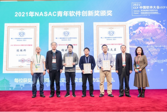 26日下午,举行了NASAC青年软件创新奖论坛,大会程序委员会共同主席、南京大学卜磊教授主持。首先由金芝教授宣布了本年度青年软件创新奖获奖人,分别为国防科技大学陈振邦、武汉大学谢晓园与南京大学蒋炎岩,由梅宏院士、吕建院士与论坛特邀报告人、华为技术有限公司胡欣蔚先生一起为获奖人颁奖。