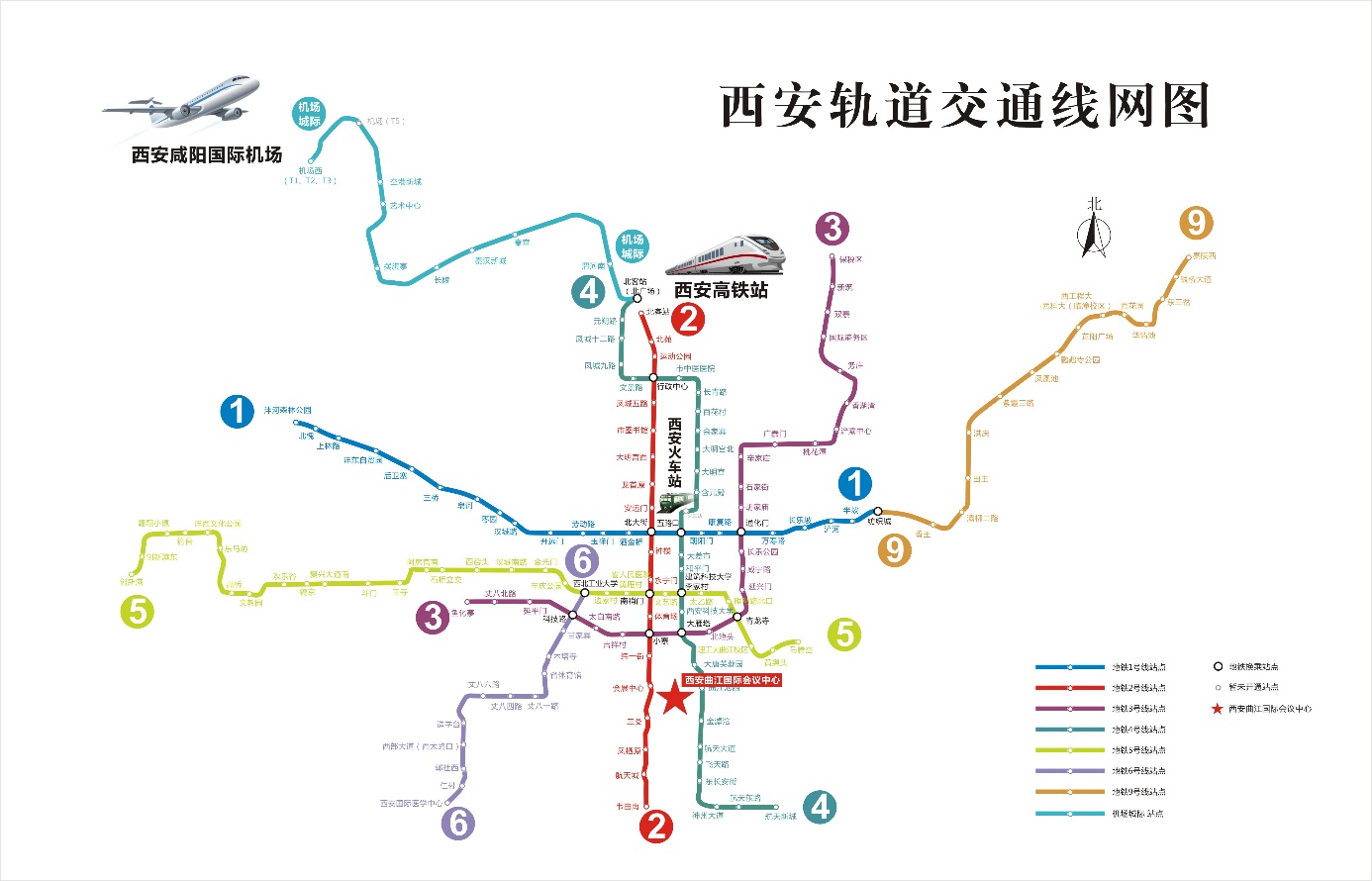 2)北出口站出步行约1.4公里,约21分钟安远门地铁口C东南口进站乘坐地铁2号线(韦曲南方向)乘坐8站—到达会展中心站C口东南口出站步行1.1公里到达曲江国际会议中心,全程约54分钟。