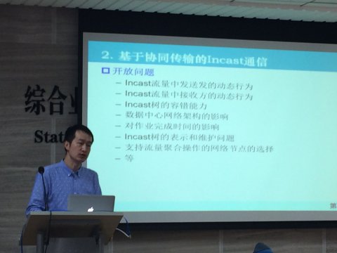 郭老师首先介绍了近年来数据中心新型体系结构设计方法方面的演变和发展趋势,即以服务器为核心的数据中心、以交换机为核心的数据中心、模块化数据中心、随机拓补的数据中心以及无线数据中心。随后,他就数据中心内关联性流量Incast、Shuffle、Multicast的网内聚合效应进行讨论,重点介绍了他在该领域的最新研究成果,即如何通过关联性流量的协同传输最大化这些流量的网内聚合增益,降低数据中心内庞大的东西向流量对网络带宽的消耗。